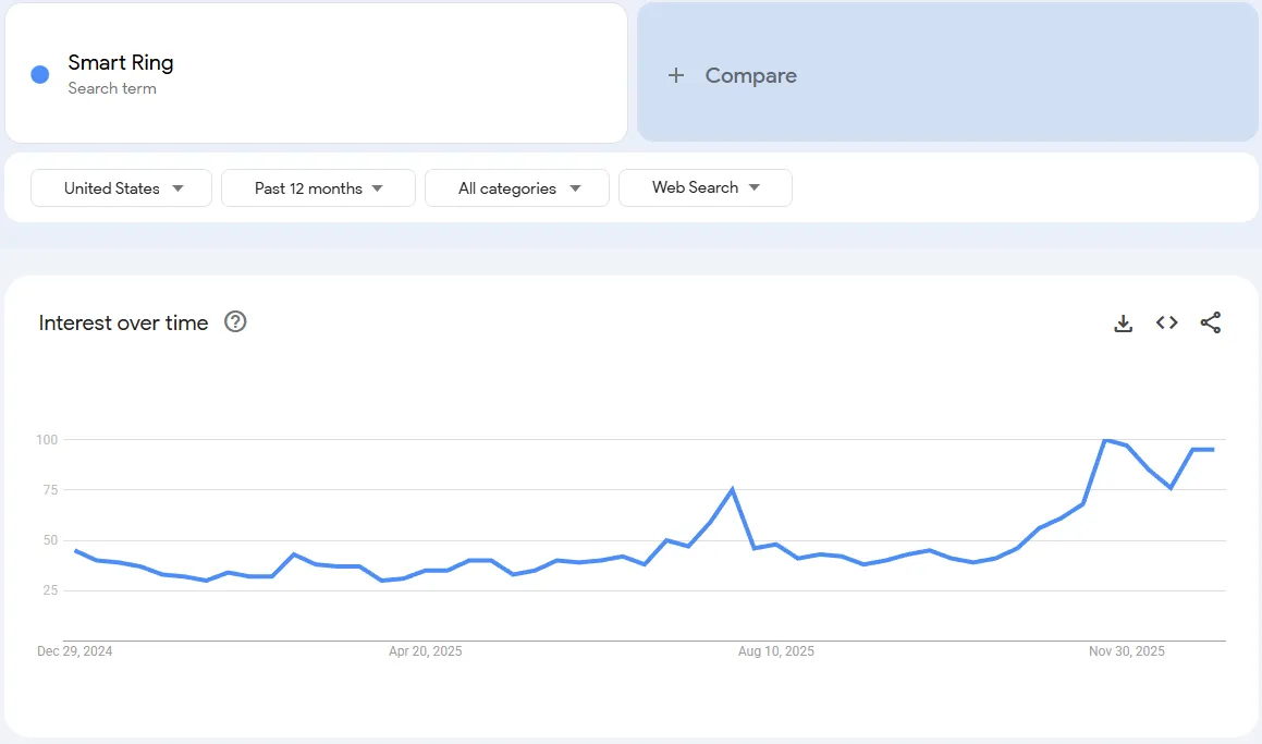 Yukarıdaki tabloya bakın. Bu, son 90 gündeki "Samsung Ring" arama hacmidir. Kasım ayındaki büyük artışı görüyor musunuz? Bu, Samsung'un eğitime milyonlarca dolar harcaması anlamına geliyor senin gelecekteki müşteriler. İçgörü: Halk artık Akıllı Yüzüğün ne olduğunu biliyor. Ancak çoğu tüketici 399 dolar ödemeye razı değil. Arama eğilimi istikrara kavuşuyor, bu da "Heyecan Aşaması"nın sona erdiği ve uygun fiyatlı seçenekler (50-80$) için "Satın Alma Aşamasının" başladığı anlamına geliyor.